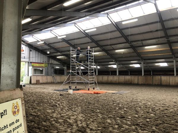 De leidingen en sproeiers boven de binnenbaan van OWF moesten nodig worden schoongemaakt. Via het netwerk van Cumela regelde Arie Schouten van Westfriese Uitdaging een steiger waarmee op hoogte gewerkt kon worden. Om 8.15 uur begon een ploeg enthousiaste vrijwilligers met de voorbereiding en opbouw van de steiger en daarna konden ze aan de slag. Het ging niet zonder slag of stoot en het was een enorme klus maar rond 16.15 kon iedereen richting huis. De leidingen en sproeiers kunnen er weer een tijd tegen!