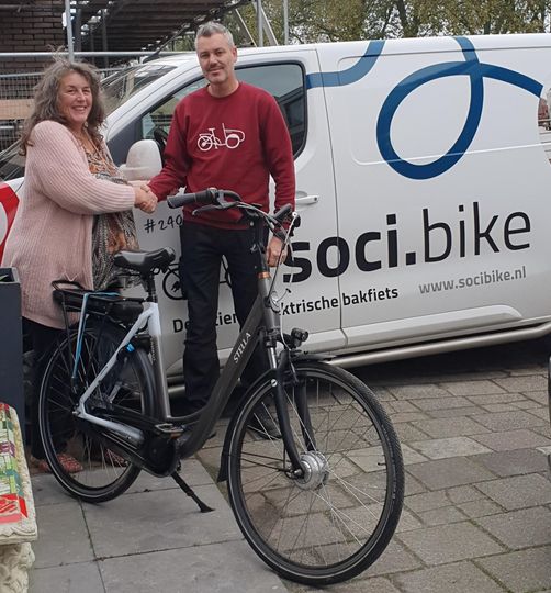 De elektrische fiets van Nicoles Huiskamer wordt gebruikt voor de 'lokale ritjes'. Op de beursvloer kwam Nicole in gesprek met Soci.bike en sloot een match. De fiets werd geheel belangeloos opgehaald en helemaal nagelopen. Alles is weer goed werkend gemaakt en het stalen ros werd ook weer thuis gebracht.