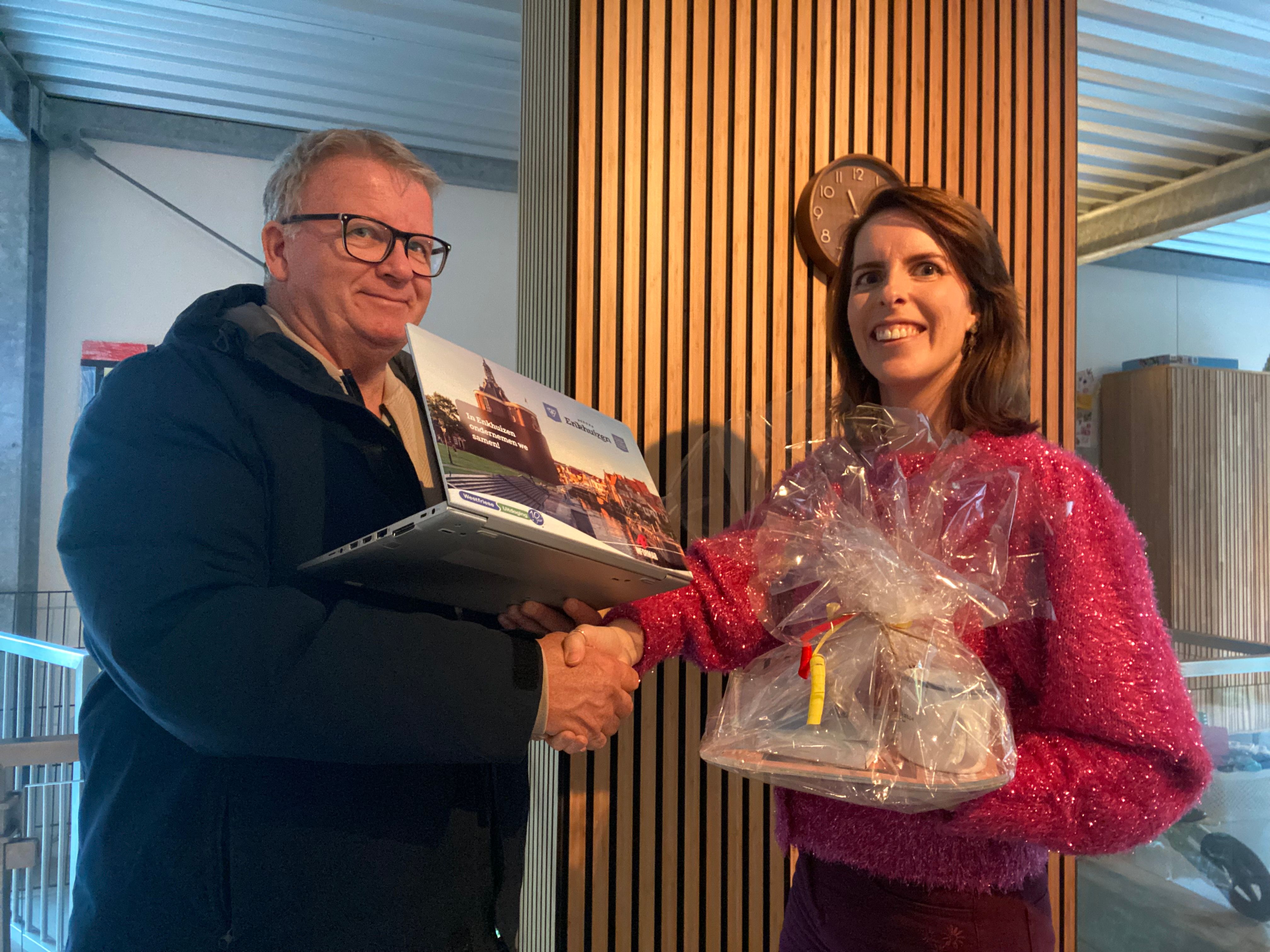 Tijdens de Westfriese Beursvloer maakte Annemieke Hageman van Stichting Marketing Enkhuizen een match met André Hundman van Informar. Annemieke was op zoek naar een laptop die gebruikt kan worden door een stagiair of als een winkelmedewerker even iets op de computer moet doen. André overhandigde haar een gepersonaliseerde laptop en kreeg in ruil een Enkhuizer pakketje. Annemieke: “We zijn erg blij met de match en vinden het onwijs leuk dat André de laptop voorzien heeft van een gave Enkhuizer sticker! Dat wordt loten om wie de laptop als eerst mag gebruiken 😉