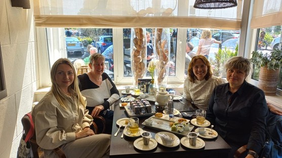 Tijdens een les over hobby’s kwam ze erachter dat een van haar studenten van tennissen houdt. Carin is lid van een tennisvereniging. Dus op naar de tennisclub. ‘Daar is op dinsdag en vrijdag een inloop. Evgenia, die ik taalles geef, is meteen warm welkom geheten. Haar dochtertje Lada komt ook vaak mee, ze werden met open armen ontvangen. Zo krijgen ze ook een bredere sociale kring.’ Sowieso houdt de Nederlandse les niet op bij het klaslokaal, vertelt Carin. ‘We hebben ook een keer met z’n vieren, dus Mariska, de twee Oekraïners en ik, een high tea gedaan in de stad. Hartstikke gezellig.’ Ook organiseren de twee regelmatig gezellige dingen, soms met een paar andere vrijwilligers, zoals een bingo of een tennisclinic voor de kinderen in de opvanglocatie.
