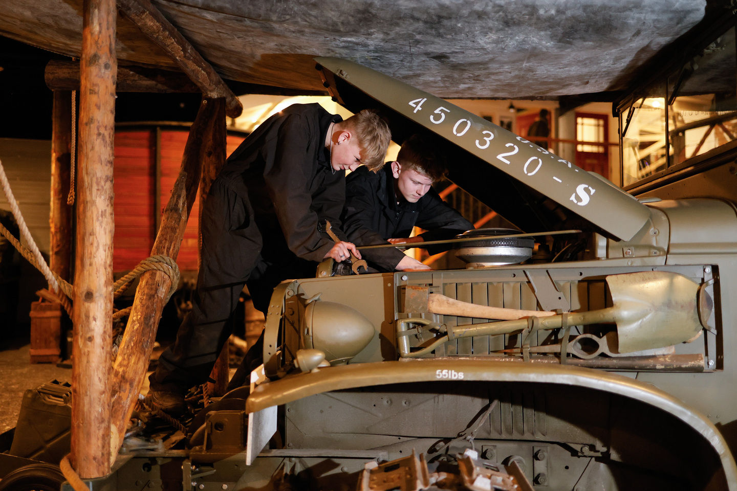 In de werkplaats staan legertrucks die de WOII nog hebben meegemaakt. “De meeste zijn 82 jaar of nog ouder", zegt Sil. “Wij zorgen dat ze blijven rijden. Assen doorsmeren, onderdelen nalopen, banden controleren. Je leert hoe zo’n motor in elkaar zit. Alles is overzichtelijk. Geen elektronica, geen sensoren. Je ziet het motorblok gewoon liggen.” Wessel knikt. “Als je bij een moderne auto de motorkap opendoet, zie je alleen maar plastic kappen en kabels. Hier is het puur mechaniek.” Dat sleutelen geeft voldoening. “Als je iets repareert en het doet het weer, dat is het mooiste wat er is", zegt Wessel. “Dan bewijs je jezelf. Wat we zelf het mooist vinden? Meerijden! Dan laat je zien dat het gelukt is een oud voertuig op de weg te houden.” Sil vult aan: “Dat is vreugde!”