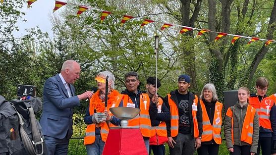 Foto boven: Vrijwilligers (met Dieneke in het midden) staan klaar om het vuur in Wageningen in ontvangst te nemen