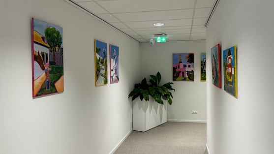 Ook hangen de kunstwerken van de cursisten in de groep van docent Thea Brouwers in de hal. Zij hebben zich laten inspireren door de kunstschilder Nick McPhail. De opdracht was om in lagen te schilderen op een achtergrond met een felle kleur. Op de schilderijen staan een muur, hoek of trap met in de omgeving een herkenbare vorm. Zoals een fiets, ligstoel of mens.