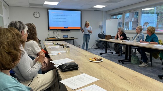 Joke is ook een van de taalvrijwilligers in de training. Ze is pas een maand bezig met het geven van taalondersteuning. ‘Via een oud-collega hoorde ik over dit vrijwilligerswerk. Ik geef de ondersteuning in de Huesmolen, samen met een andere trainer begeleiden we een groep van tien tot twaalf mensen uit alle windstreken.’ Ze is enthousiast over de training. ‘Ik ga overleggen met de andere trainer hoe we dit in onze taalondersteuning kunnen opnemen. En veel van de materialen kende ik nog niet, maar ik begrijp dat ik die ook kan lenen van Vrijwilligerspunt. Daar ga ik binnenkort mee aan de slag.’