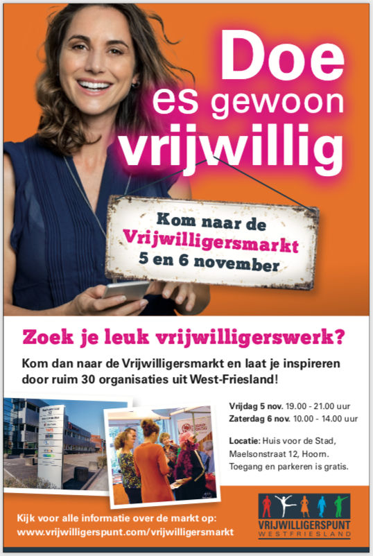 Op zoek naar vrijwilligerswerk? Kom op 5 of 6 november naar de Vrijwilligersmarkt! Wil je vrijwilligerswerk doen, maar weet je niet wat de mogelijkheden zijn? Heb je behoefte aan (meer) sociale contacten? Vind je het leuk om samen activiteiten te doen en je tegelijkertijd in te zetten voor een ander? Kom dan vrijdag 5 november of zaterdag 6 november naar de Vrijwilligersmarkt van Vrijwilligerspunt Westfriesland en laat je inspireren! Toegang is gratis.