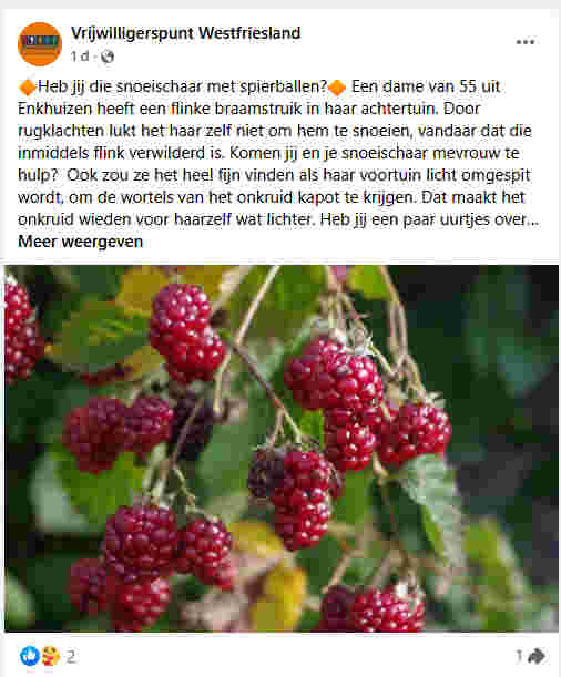 - Uitlichten op de Facebookpagina van Vrijwilligerspunt, en in lokale groepen die voor de vacature relevant zijn.