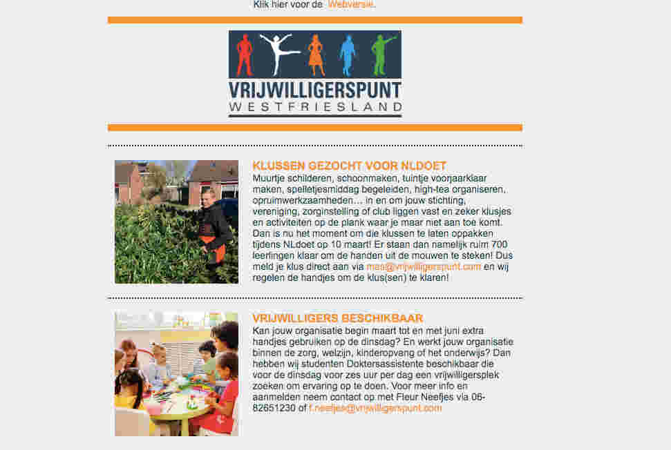 Wil je op de hoogte blijven van het nieuws over vrijwilligerswerk en wat Vrijwilligerspunt voor organisaties kan betekenen? Meld je dan aan voor de nieuwsbrief. De nieuwsbrief verschijnt iedere maand. Via onderstaande button kun je de laatste nieuwsbrieven teruglezen en je aanmelden.